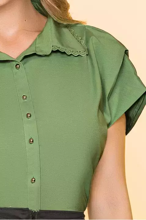 A camisa feminina Andrezza é confeccionada em viscose leve e fresca, ideal para compor looks elegantes e confortáveis em qualquer ambiente. Apresenta gola tradicional com delicado acabamento em guipir na barra, que adiciona charme e sofisticação à peça. O fechamento frontal com botões dourados traz um toque de elegância e refinamento.