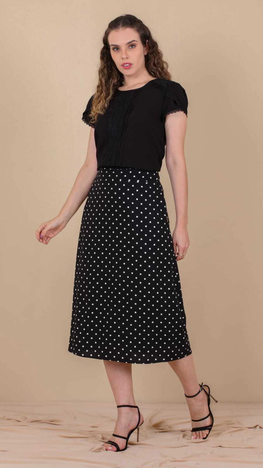 A Saia Olívia é a escolha perfeita para quem busca conforto sem abrir mão do estilo. Confeccionada em viscose preta com poás brancas, ela apresenta um cós largo que ajusta bem à cintura. Os bolsos funcionais nas laterais são um toque de praticidade, enquanto a modelagem evasê midi oferece movimento e um visual moderno. É uma peça forrada que garante leveza e um caimento fluido.
