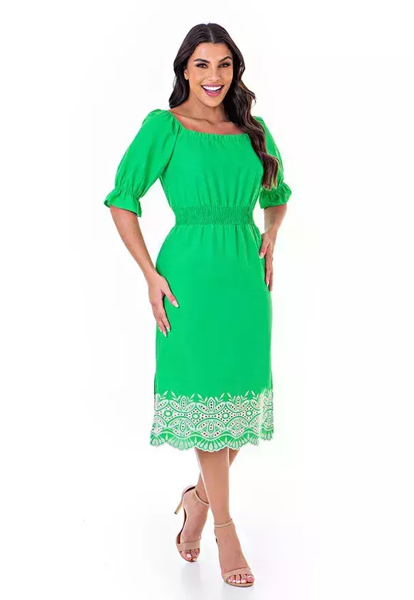 A cintura com lastex valoriza a silhueta, enquanto a saia de shape reto com fendas laterais traz leveza e um toque moderno ao visual. O grande destaque fica por conta do barrado bordado, que confere charme e sofisticação ao look.