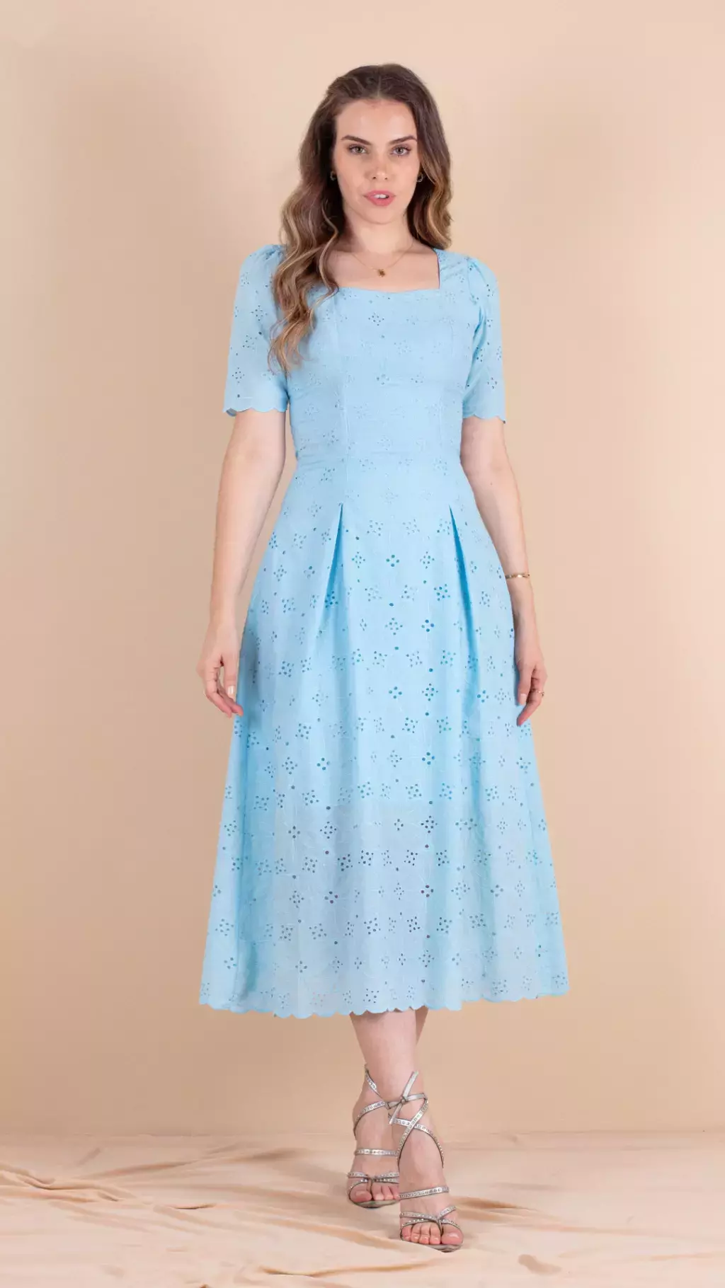 Este elegante vestido midi em laise de algodão apresenta um decote princesa que valoriza o colo. As mangas retas, com leve franzido no ombro e barrado bordado, adicionam um toque romântico e sofisticado. A saia, com duas pregas frontais e barrado de bico bordado, confere movimento e fluidez à peça. Com zíper nas costas para facilitar o uso e totalmente forrado para maior conforto.